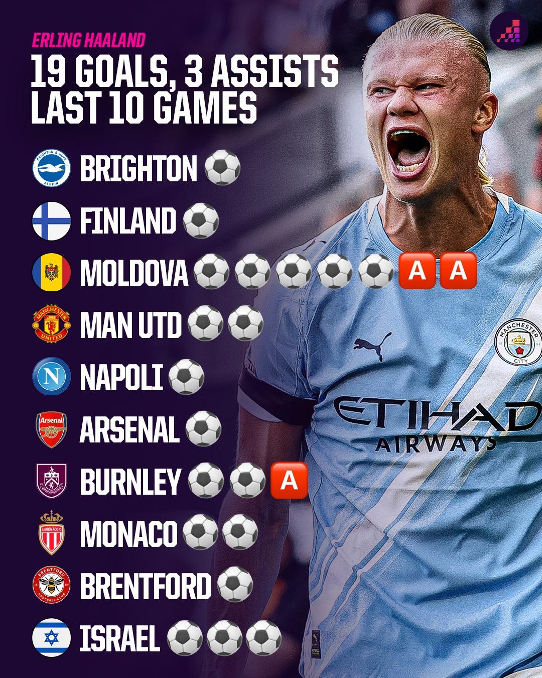 此外,在过去的10场俱乐部+国家队比赛中,哈兰德状态火热,贡献19球3助。