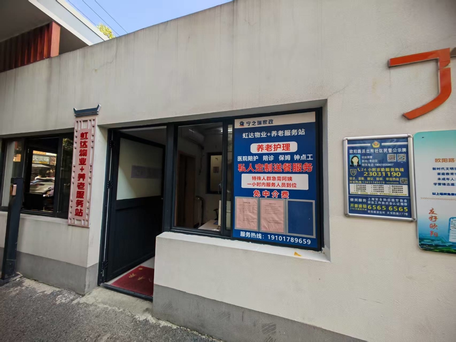 蒋家桥小区,是欧阳路最早探索“物业+养老”的小区。记者看到,小区的门岗旁边就是一个虹达物业+养老服务站。