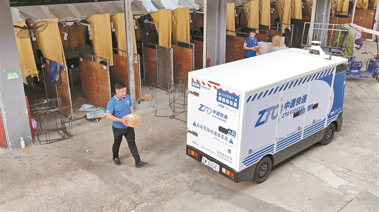中通快递深圳双龙网点无人车装货中。 受访单位供图