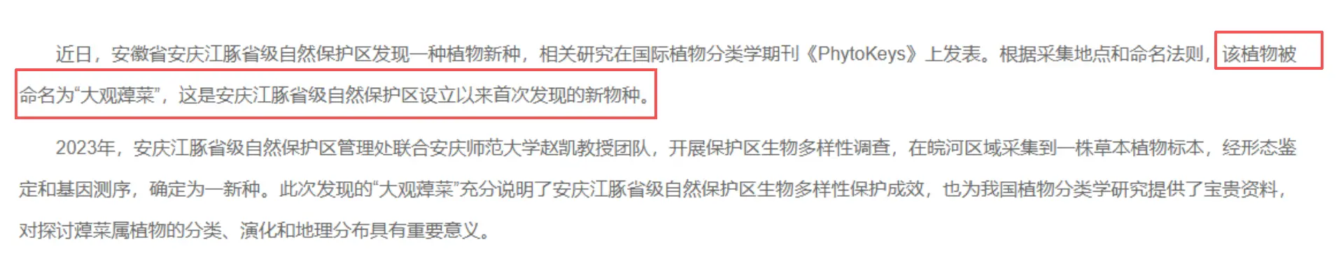 而且安徽近年来,也加大了对于生物多样性的保护力度,建立了许多保护区,发现大观蔊菜的安庆江豚省级保护区,就是其中之一。