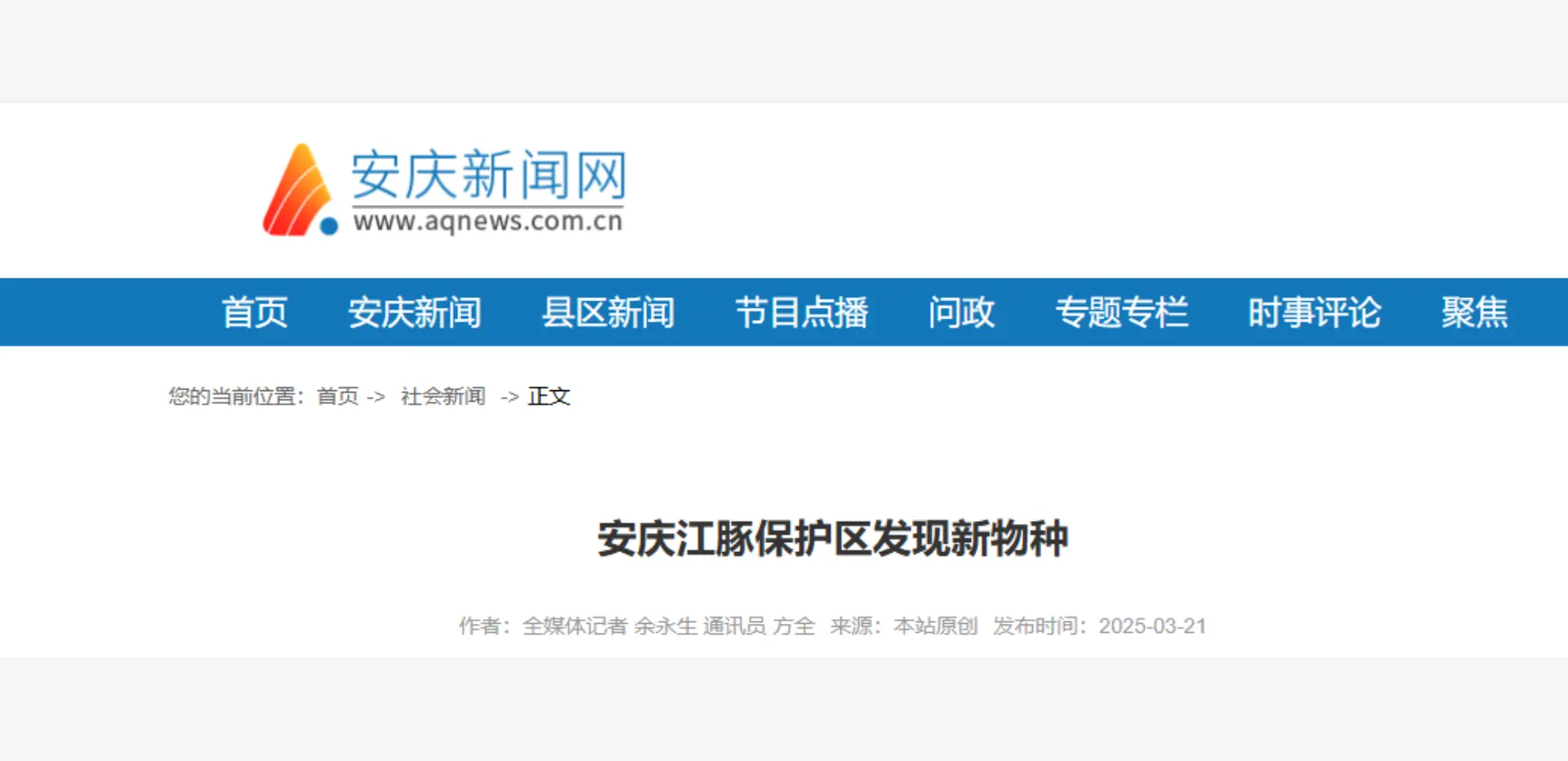 信息来源:安庆新闻网《安庆江豚保护区发现新物种》2025-3-21