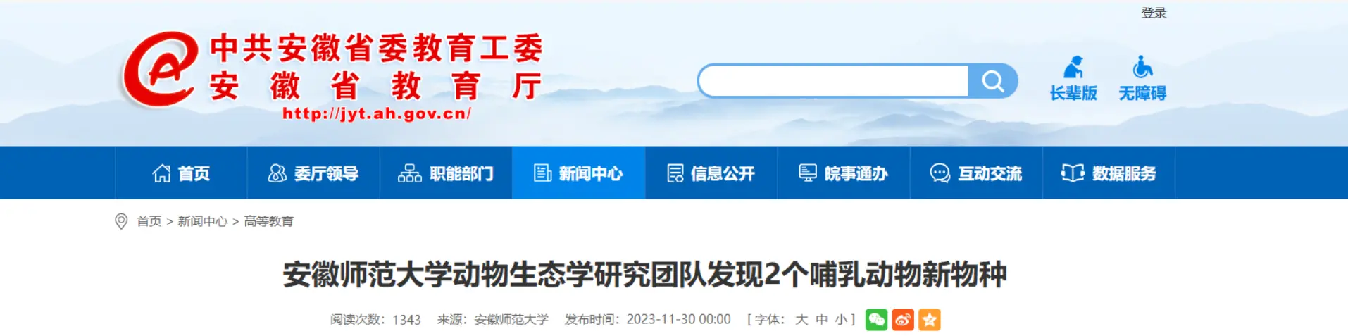 信息来源:安徽省教育厅 《安徽师范大学动物生态学研究团队发现2个哺乳动物新物种 》2023-11-30